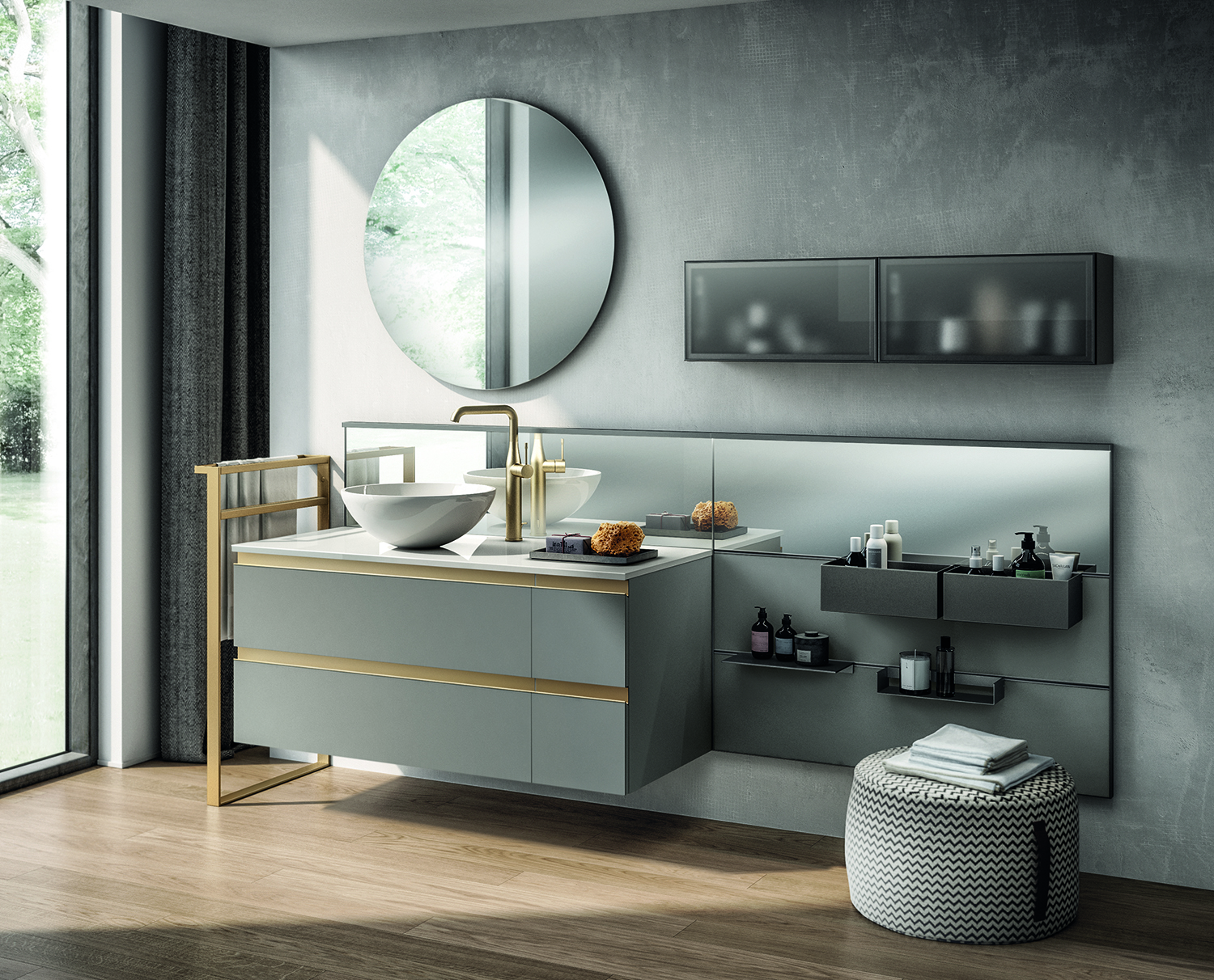 Tratto furniture collection Vanity unit in Titanium Grey with Mineralmarmo top with Line System Modular storage with mirrored finish with removable containers and shelves from £5000 Scavolini